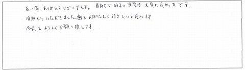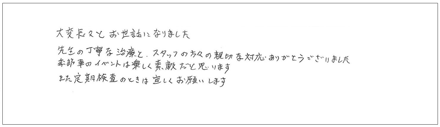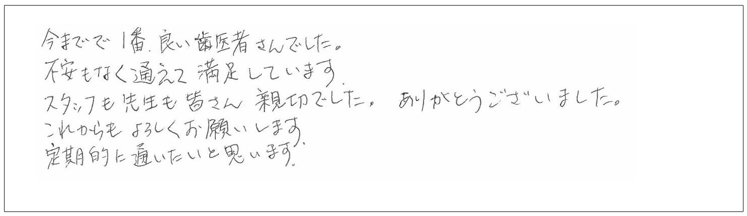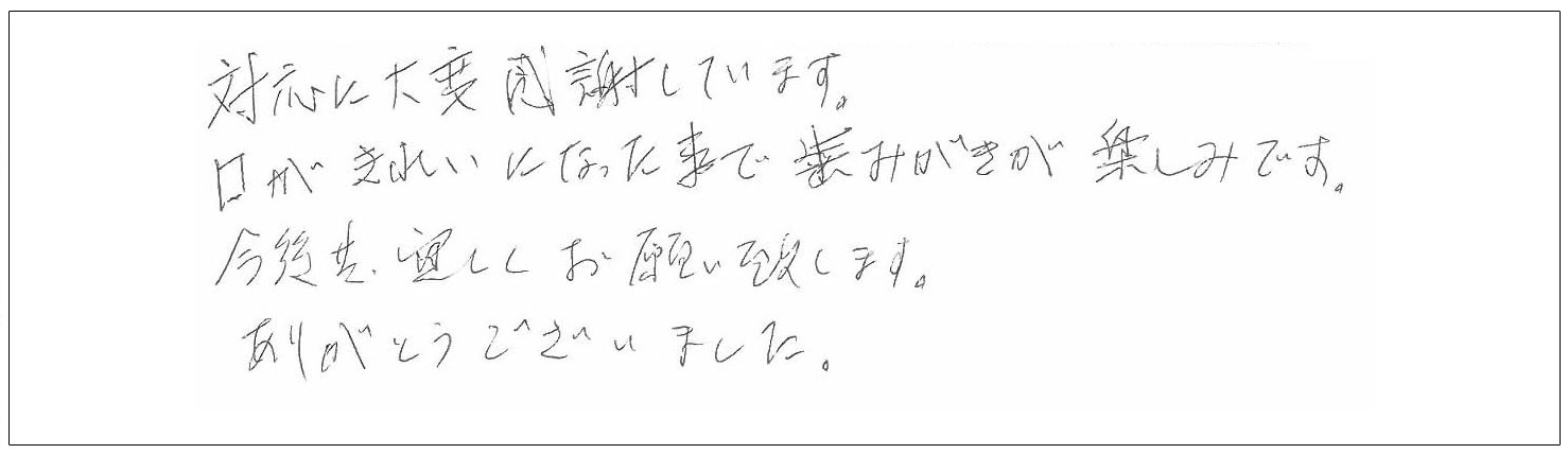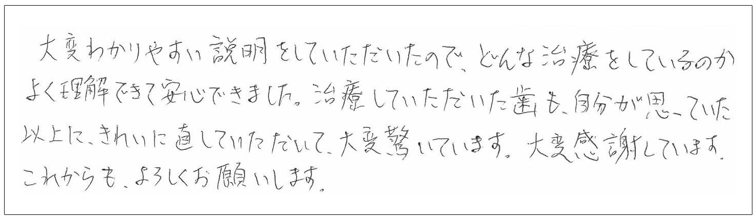 大変わかりやすい説明をしていただいたので、どんな治療をしているのかよく理解できて安心しました。治療して頂いた歯も、自分が思っていた以上にきれいに直していただいて、大変驚いています。大変感謝しています。これからもよろしくお願いします。