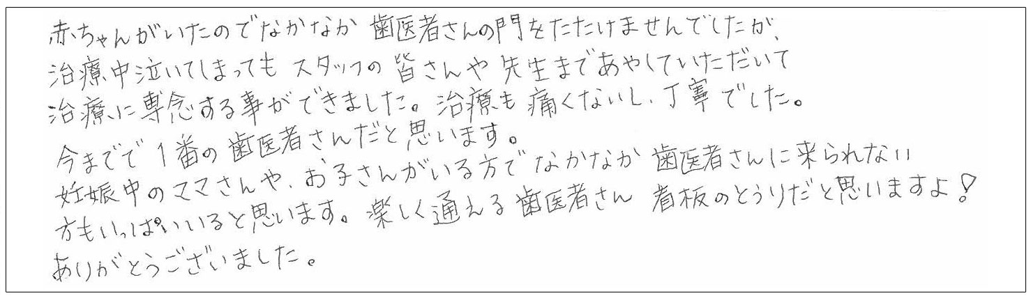 赤ちゃんがいたのでなかなか歯医者さんの門をたたけませんでしたが、治療中泣いてしまってもスタッフの皆さんや先生まであやしていただいて治療に専念することが出来ました。治療も痛くないし丁寧でした。今までで一番の歯医者さんだと思います。