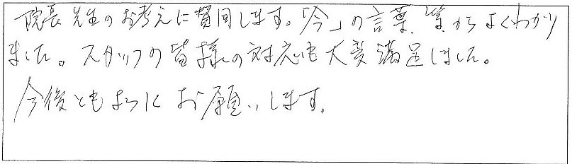 院長先生のお考えに賛同します。「今」の等からよくわかりました。スタッフの皆様の対応も大変満足しました。