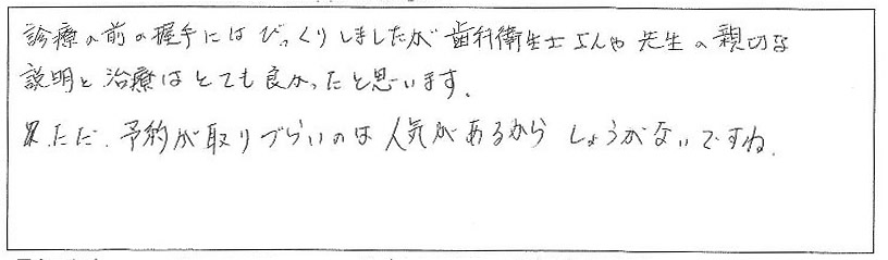 診療の前の握手にはびっくりしましたが、歯科衛生士さんや先生の親切な説明と治療はとても良かったと思います。