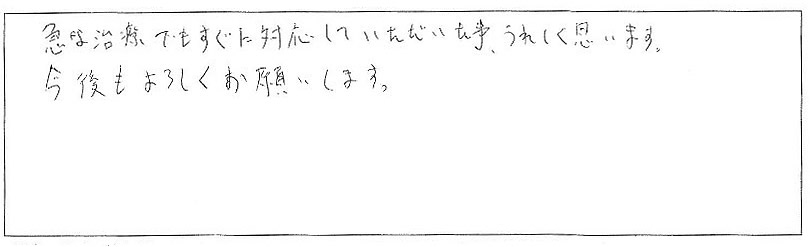 急な治療でもすぐに対応していただいた事、うれしく思います。