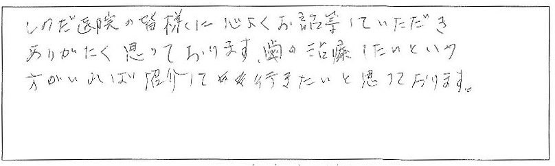 しのだ歯科の皆様に心よくお話等していただきありがたく思っております。