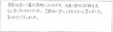 受信する度に丁寧な説明をしていただき、治療に関する不可解な点などまったくありませんでした。定期的に見て頂きたいと思いました。ありがとうございました。