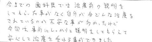 今までの歯科医では治療前の説明をしてもらったことが無く、自分が今どんな治療をされているのか不安なことが多かったけど