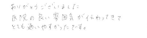 こんなにきちんと歯科に通えたのは初めてでほんとに皆さんのおかげですし、感謝の気持ちでいっぱいです。ありがとうございました。今後ともどうぞよろしくお願い致します。
