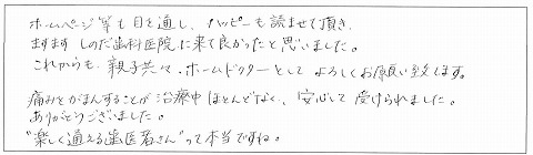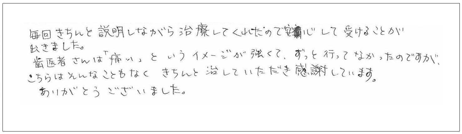 大変わかりやすい説明をしていただいたので、どんな治療をしているのかよく理解できて安心しました。治療して頂いた歯も、自分が思っていた以上にきれいに直していただいて、大変驚いています。大変感謝しています。これからもよろしくお願いします。