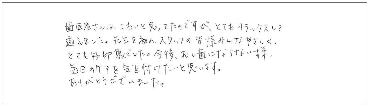 歯医者さんは怖いと思ってたのでしすが、とてもリラックスして通えました。先生を含めスタッフの皆様みんなやさしく、とても好印象でした。今後、虫歯にならないよう毎日のケアを気を付けたいと思います。